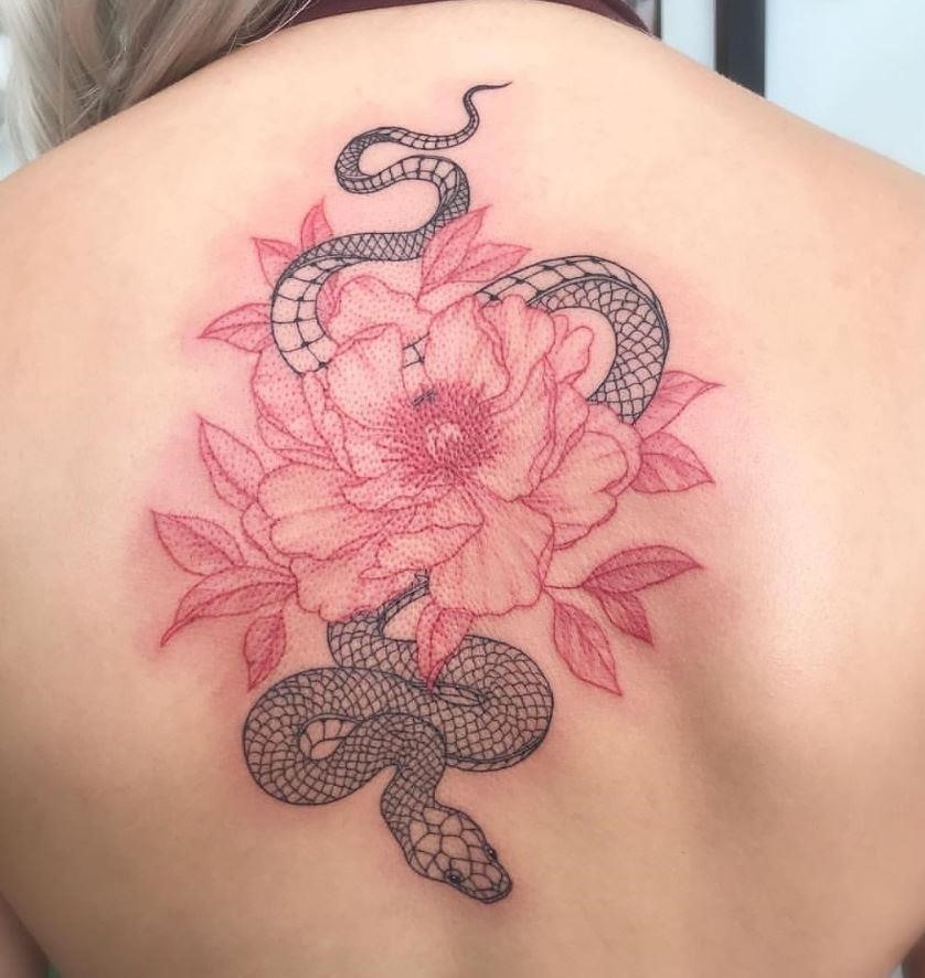 Pink Ink Hawaiian Flower Tattoo On Right Back Shoulder 1