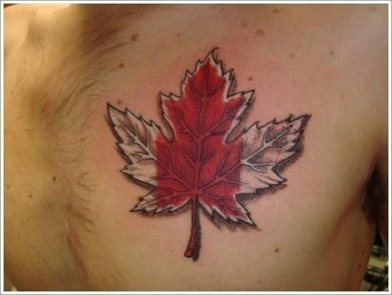 Mens black ink upper chest shaded maple leaf tattoo ideas