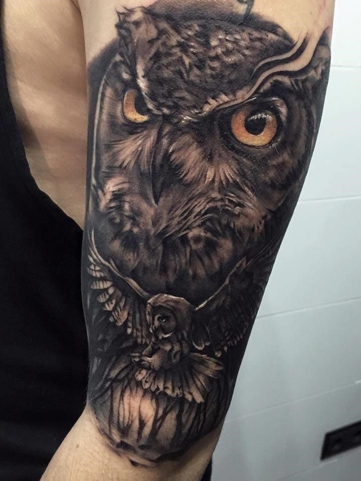 Orange eyed owl mens realistic arm quarter sleeve tattoo