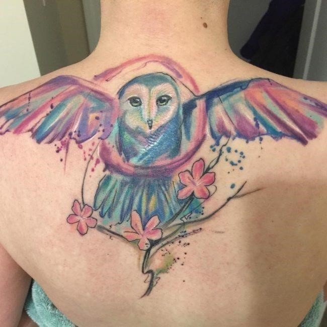 An owl tattoo design by tattoo artist Kelly Doty who specializes in 3D cartoon tattoos