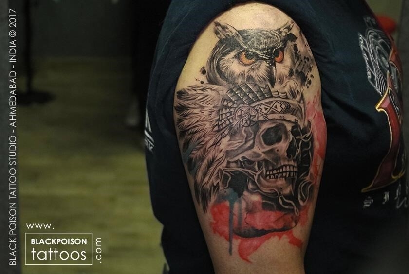 Incredible right side of chest and shoulder owl tattoo on male painting style ink