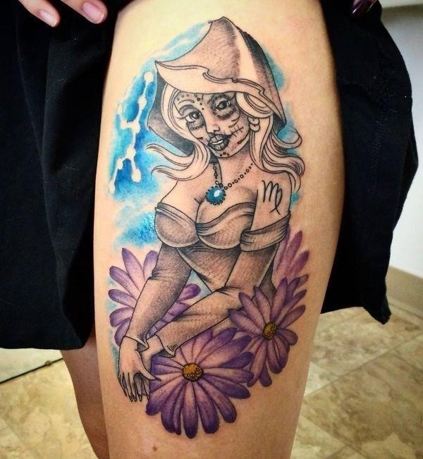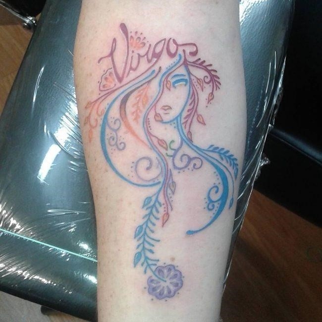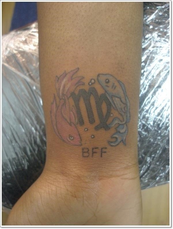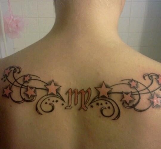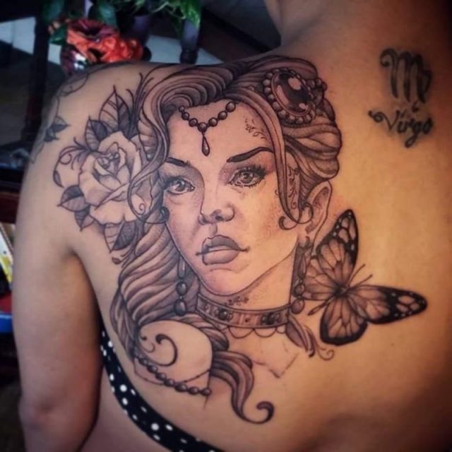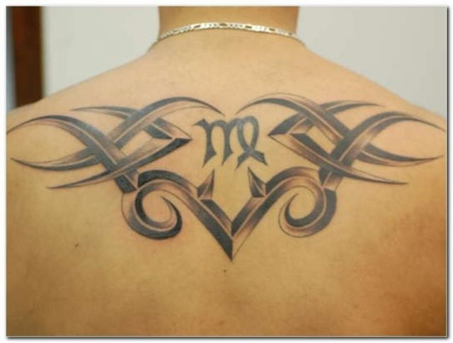 Black And Grey Tribal Virgo Zodiac Tattoo On Upper Back